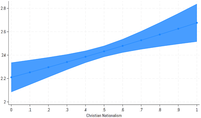 (Figure 2: Predicted Average Ideal Number of Children for Americans Across Christian Nationalism. Source: General Social Survey (2021). Error ban represents the 95% confidence interval.)